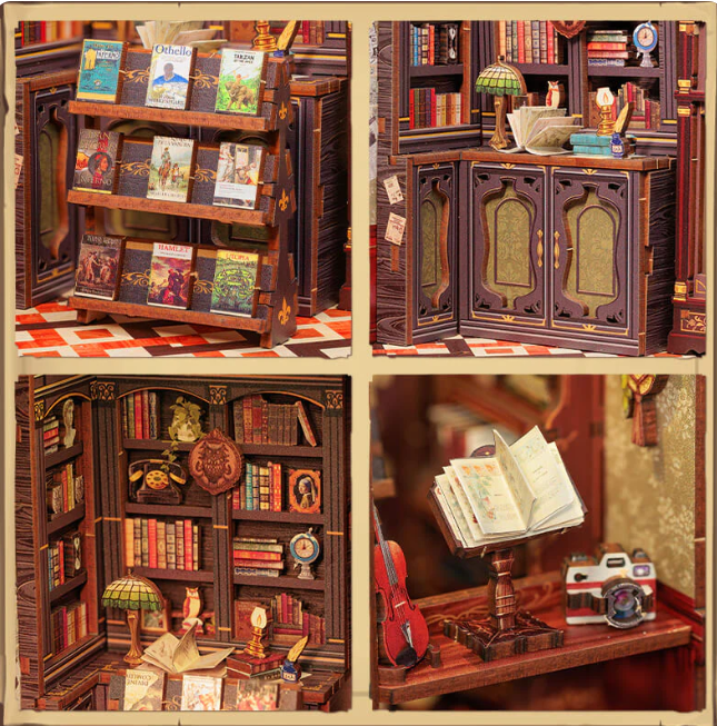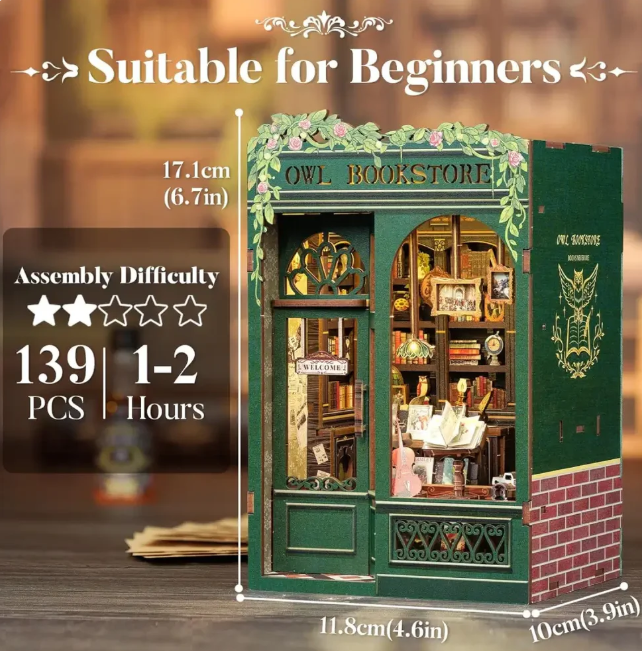 Jedes Set enthält vorgeschnittene und vorbemalte Holzteile, eine Schritt-für-Schritt-Anleitung, LED-Lichtkomponenten sowie alle speziellen Materialien, die für die Szene benötigt werden.