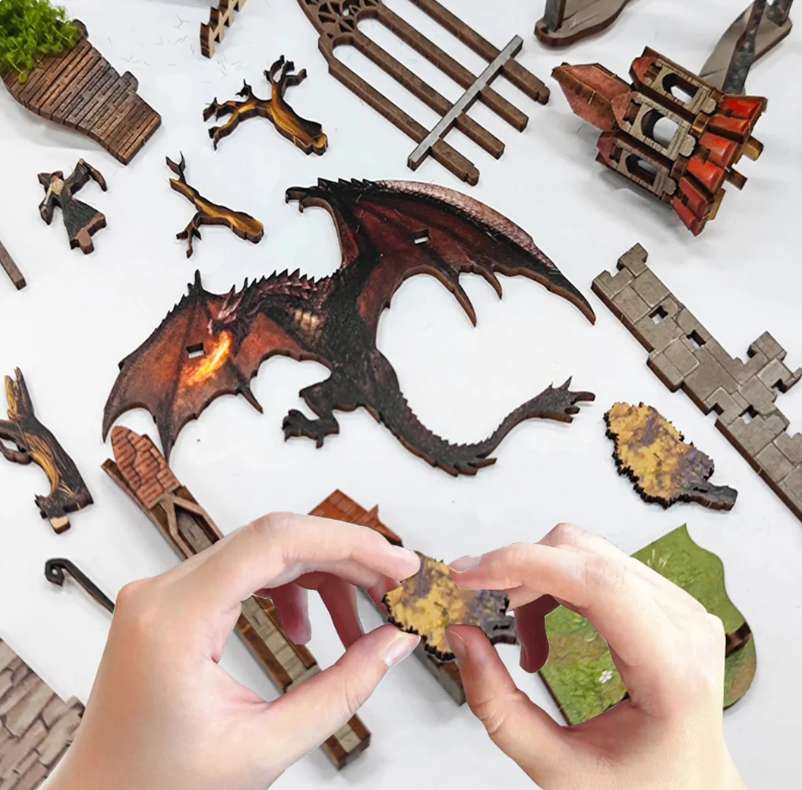 Jedes Set enthält vorgeschnittene und vorbemalte Holzteile, eine Schritt-für-Schritt-Anleitung, LED-Lichtkomponenten sowie alle speziellen Materialien, die für die Szene benötigt werden.