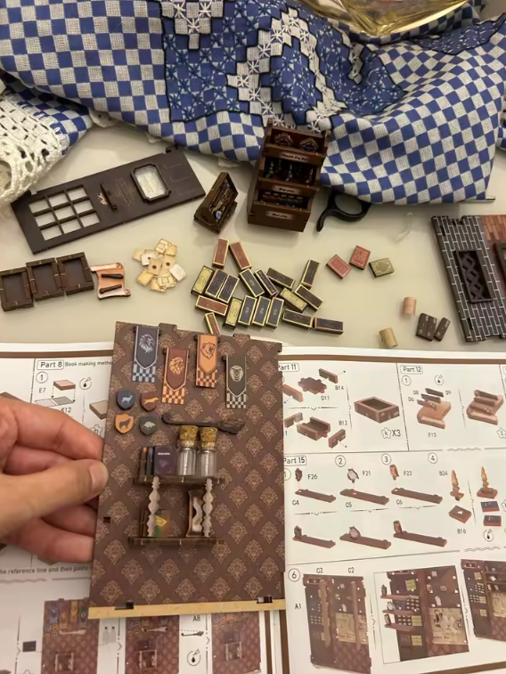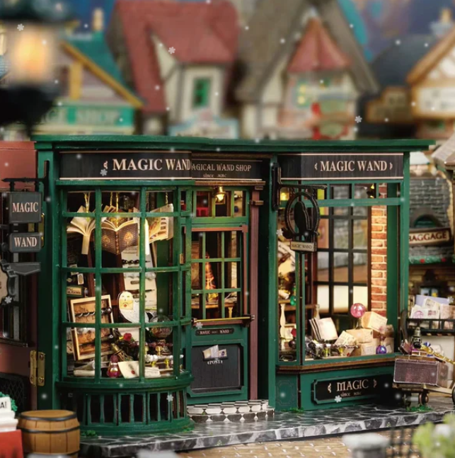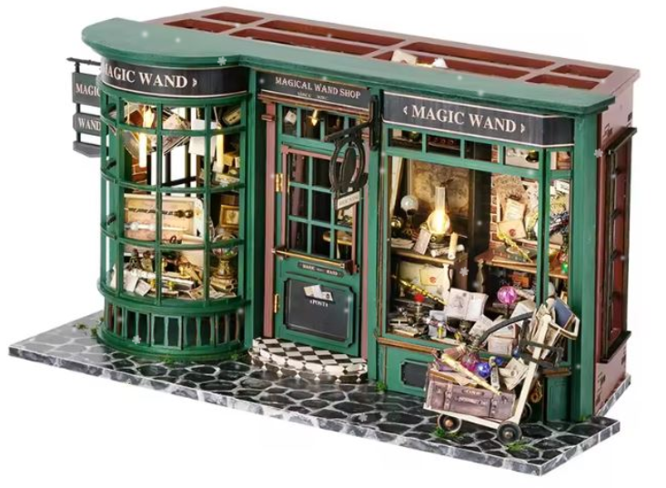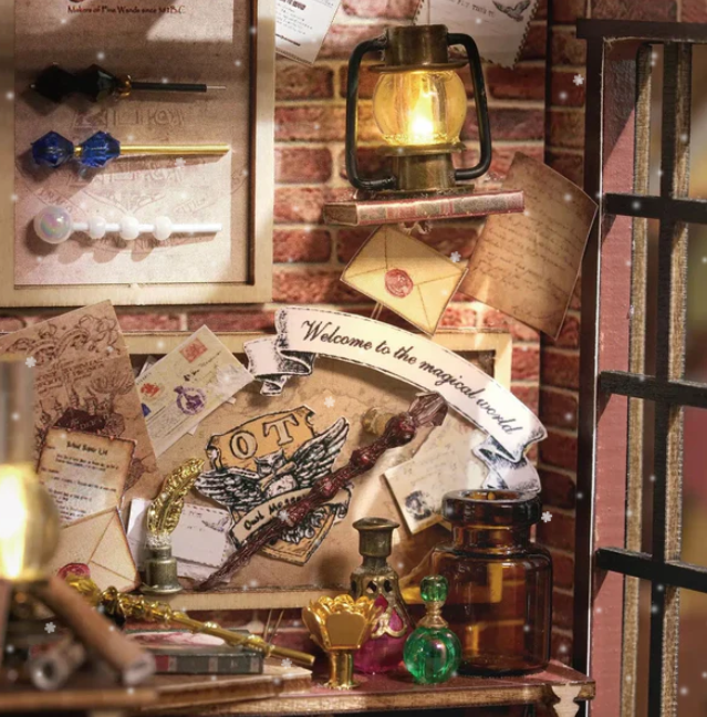 Jedes Set enthält vorgeschnittene und vorbemalte Holzteile, eine Schritt-für-Schritt-Anleitung, LED-Lichtkomponenten sowie alle speziellen Materialien, die für die Szene benötigt werden.