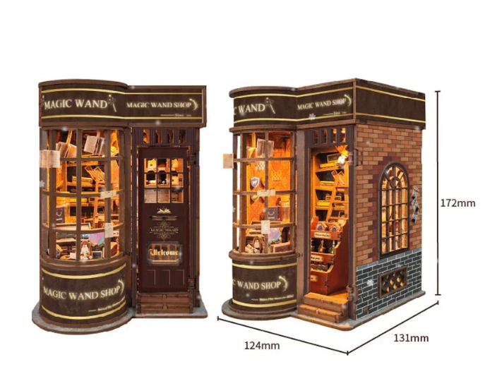 Jedes Set enthält vorgeschnittene und vorbemalte Holzteile, eine Schritt-für-Schritt-Anleitung, LED-Lichtkomponenten sowie alle speziellen Materialien, die für die Szene benötigt werden.